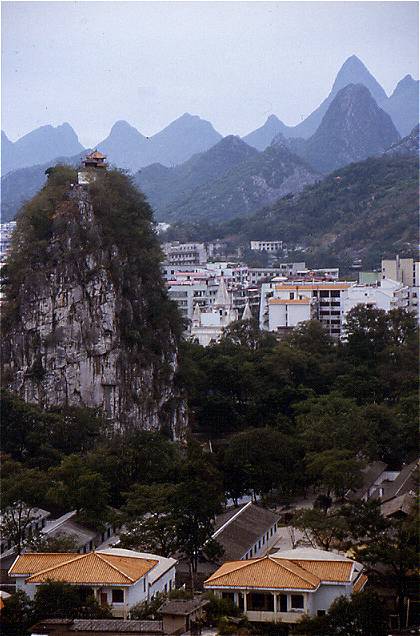 Buchen an der Rezeption einen Bootsausflug auf dem Li-Fluß für morgen und machen uns auf den Weg zum berühmten "Elefantenrüssel-Berg". Erkunden diesen und den dazugehörigen Park und lassen uns dann von einem Taxi zum gleichfalls berühmten "Fubo-Berg" bringen. Durchwandern Höhlen, bewundern Felsskulpturen und betrachten die lustige, mit Kalkkegeln übersäte Landschaft vom Gipfel des Berges. Unser nächstes Ziel ist die "Schilfrohrflöten-Höhle" am Stadtrand, eine riesige Tropfsteinhöhle, die zwar zum Teil kitschig beleuchtet, aber doch ziemlich beeindruckend ist. Besteigen dann noch den gegenüberliegenden Hügel und haben einen netten Blick über die Karstkegel, die wie Gugelhupfe die Landschaft überziehen. Zurück im Hotel verschnaufen wir etwas und nach einem kleinen Einkaufsbummel besuchen wir wieder das Lokal von gestern abend.