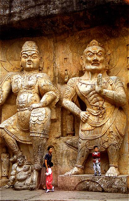 Heute sind wir schlauer und fahren mit dem Bus. Nach einmal Umsteigen kommen wir, wie viele Chinesen auch, beim "Tempel des Seelenfriedens" an, einem der wichtigsten im ganzen Land. Wir besichtigen zuerst den Skulpturenpark, in dem mehr oder weniger echte, indisch anmutende Götterstatuen herumstehen. Spazieren weiter, einem kleinen Bach entlang zum eigentlichen Tempel, der ganz in die Rauchschwaden der vielen geopferten Räucherstäbchen gehüllt ist. Drinnen wird der zweitgrößte Holzbuddha Chinas, der vergoldete Dickbauch-Buddha, verehrt. Schlendern noch durch den umliegenden Essens- und Souvenirmarkt und bewundern am Rückweg die echten, alten Felsskulpturen am Hang. Drängen uns dann noch einmal, wie in besten Schulbuszeiten, in einen Linienbus und fahren heimwärts zum Hotel. Werden dort wieder verläßlich abgeholt und zum Bahnhof gebracht. Besteigen einen brechendvollen Waggon und düsen pünktlich in zwei Stunden in die Wirtschaftsmetropole Shanghai. Finden im Wirbel dort nicht gleich unseren "lokal guide", aber irgendwie schaffen wir es doch zu unserem Hotel. Erkunden gleich die Umgebung und wählen unterhalb der zweistöckigen Schnellstraße ein kleines Restaurant für das Abendessen. Bei unserem Eintreten wird es kurz still im Lokal, aber wir werden wie fast immer freundlich, wenn auch mit gewissen Sprachproblemen, bedient.