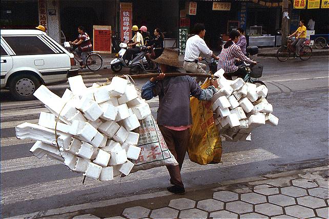 Haben heute das erste Mal ein Problem, ein Taxi zu bekommen. Es sind hunderte auf der Straße, aber so gut wie alle sind schon besetzt, und die anderen treibt unser Fahrtziel, der "Tempel des Seelenfriedens", in die Flucht. Erst mit Hilfe des Portiers ergattern wir ein sündteures Gefährt, mit dem wir aber 30 Minuten für 500 m brauchen. Entnervt geben wir auf und lassen uns am Ufer des Westsees absetzen. Mit unendlich vielen Chinesen spazieren wir die Seepromenade entlang, überqueren die künstlich angelegte Wasserfläche auf einem der Dämme, besuchen ein Stempelmuseum und organisieren endlich am Südende des Sees eine Motorrad-Rikscha, die uns zur "Quelle des laufenden Tigers" bringt. Auch in dieser Parkanlage wimmelt es von Menschen, aber keine westlichen Touristen hellen das Bild auf. Ergattern nun ein Taxi zur hölzernen "Pagode der sechs Harmonien", die über dem Fluß liegt und einen netten Blick in die Landschaft gewährt. Fahren weiter westwärts zum Zoo und haben dann für die Heimfahrt dasselbe Problem wie am Vormittag - alle Taxis sind belegt. Geben uns das Erlebnis einer Busfahrt in China, eine Sardinenbüchse ist Platzverschwendung dagegen! Jetzt kapieren wir endlich den Grund für die Menschenmassen: zum 50-Jahr-Jubiläum der Staatsgründung haben die Chinesen eine ganze Woche frei bekommen, halb China ist auf Urlaub. Haben heute nicht mehr viel vor, besorgen nur noch etwas Proviant gleich um die Ecke am Markt.
