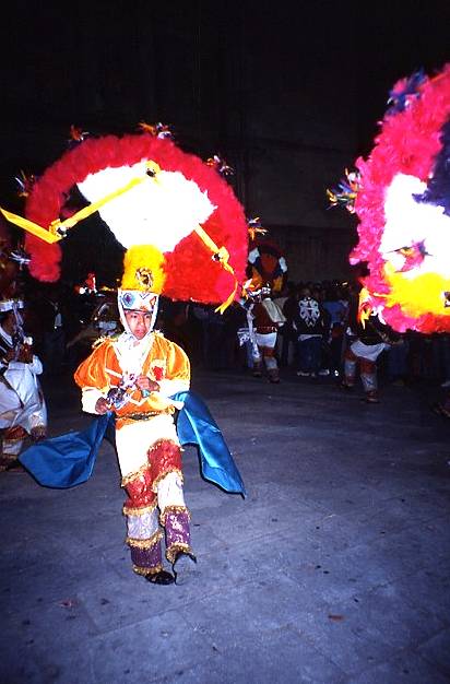 Vom nördlich des Zentrums gelegenen Busbahnhof fahren wir um 11:00 Uhr mit einem Videobus der Linie ADO nach Oaxaca. Diese Fahrt dauert mit einer 20-minütigen Pause gute 4 Stunden. In Oaxaca angekommen beziehen wir gleich das gebuchte Zimmer im Hotel Francia (ist aber keine Empfehlung!) und machen uns dann auf zur ersten Stadtbesichtigung. Die Kathedrale am nahegelegenen Zócalo gibt nicht viel her, aber 5 Cuadras nordwärts, am anderen Ende der Fußgängerzone, erwartet die Kirche Sto. Domingo die Besucher mit einer überwältigenden Pracht aus Stuck, Gold und Gemälden. Auch hier gibt es wieder eine Rosenkranzkapelle mit einem überreich geschmückten Rokoko-Altar. Auf der Suche nach einem Abendessen bummeln wir noch ein bißchen durch die Straßen, vergleichen die Angebote diverser Reisebüros, buchen für morgen einen Ausflug nach Tule und Mitla (mit sonstigem Drumherum) und am Heimweg schauen wir vor der Kathedrale einer Gruppe Volkstänzern in bunten Indiogewändern zu.