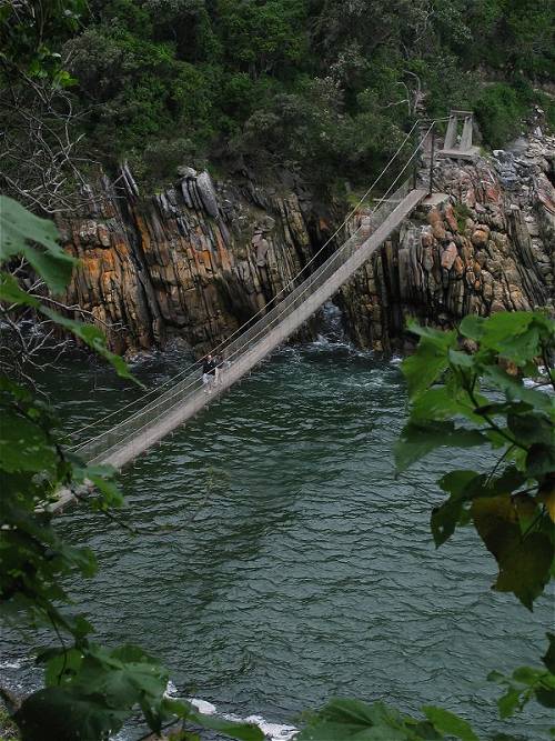 Der N2 folgen wir dann Richtung "Garden Route", dummerweise folgen uns dicke Regenwolken. Schauen uns trotzdem den "Big Tree" an und biegen um ca. 13:00 Uhr auf die Zufahrtsstraße zum Tsitsikamma Nationalpark am Storms River Mouth ab. Spazieren über einen mit Planken belegten Weg zur Hängebrücke über diese Flußmündung, lauschen der Brandung und verlassen bald wieder über die kurvige Straße den Nationalpark.