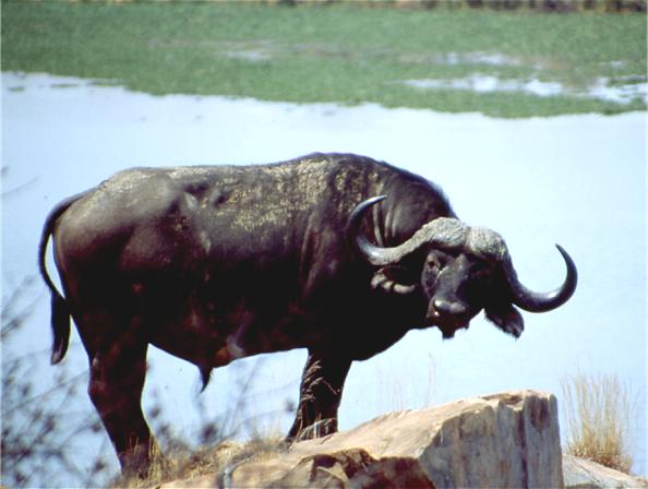 Plötzlich sehe ich aus dem Augenwinkel neben unserem Unterstand einen Büffel, der gemächlich ein paar Grasbüschel abfrißt und sich dann wieder verdrückt. Jetzt verstehe ich, warum der Weg vom Parkplatz zum Unterstand palisadenbewehrt ist. (Auf dem Weg zurück zum Auto sind wir nicht mehr ganz so sorglos wie bisher an den "sicheren" Plätzen)