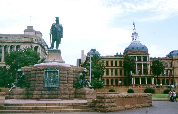 Schon kurz nach dem Zimmerbezug fahren wir ins Zentrum der Stadt und mit Hilfe des Hertz-Straßenplans gelangen wir auch bald zum Church-Square, auf dem aber leider an einem Sonntag Nachmittag nicht viel los ist. Vertilgen in einem Lokal am Platz ein Pub-Menü, schlendern durch die leeren Seitenstraßen und besuchen dann das Paul-Kruger-Haus und das Transvaal-Museum mit Ausstellungen über Urgeschichte, Geologie und südafrikanische Vögel.