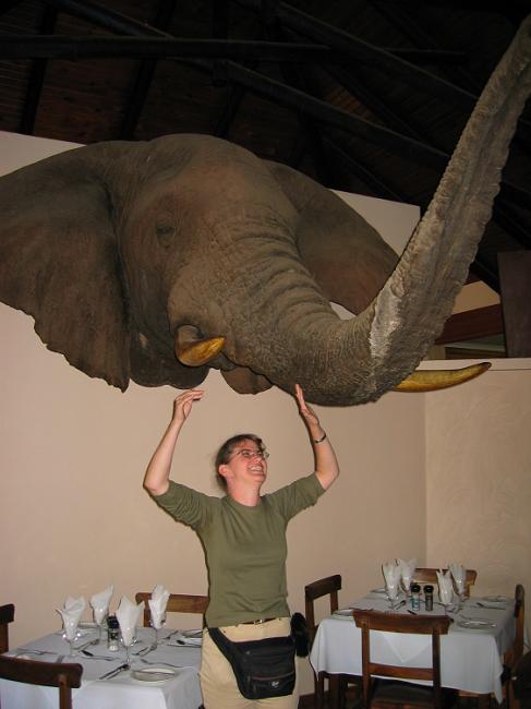 In der Nacht hat es geregnet und irgendwie ist heute alles langsam. Das Frühstück ist noch nicht fertig, weil die Bediensteten bei so einem Wetter länger zur Arbeit brauchen, wir sind auch noch ganz träge. Während wir warten, bis das Buffet fertig ist, wird uns eine Tagessafari in den Addo-Elephant Park mit anschließendem Besuch auf der privaten Schotia-Ranch angeboten -> mit ZAR 950,--p.P. nicht gerade billig, aber wir werden gefahren, erfahrene Ranger suchen und erklären die Fauna und Flora, Eintritt, Lunch und Dinner sind im Preis auch inkludiert. Das ganze dauert ca. von 11:00 bis 23:00 Uhr und ist, speziell an trüben Tagen wie diesen, ein ganz spezielles Erlebnis. Also gut, machen weiter auf Luxus und buchen. Werden noch mit Feldstechern ausgerüstet, Windjacken können wir auch leihen und so ausgerüstet werden wir von einem Ranger namens Malcolm Bean abgeholt. Fahren mit einem klimatisierten Minibus, lesen noch ein deutsches Pärchen auf, und lassen uns zum Addo Elephant Nationalpark bringen. Dort werden wir noch mit Wasser und Chips versorgt, im Restaurant werfen wir einen Blick auf den präparierten Kopf des legendären Elefantenbullen Hapor und dann geht's schnurstracks zum großen Wasserloch am anderen Ende. Malcolm stellt den Bus etwas abseits der ganzen anderen Autos am Weg ab und so kommen die Elefanten ganz in unsere Nähe. Leider finden gerade Straßenbauarbeiten statt und der Lärm der Baumaschinen stört die Idylle und die Tiere flüchten schon nach wenigen Minuten am Wasser. Durch den Park, der dicht begrünt ist, fahren wir zurück zum Eingang, ohne noch viele Tiere zu sehen, nur ein seit 4 Monaten toter Elefant ist eine Erwähnung wert.