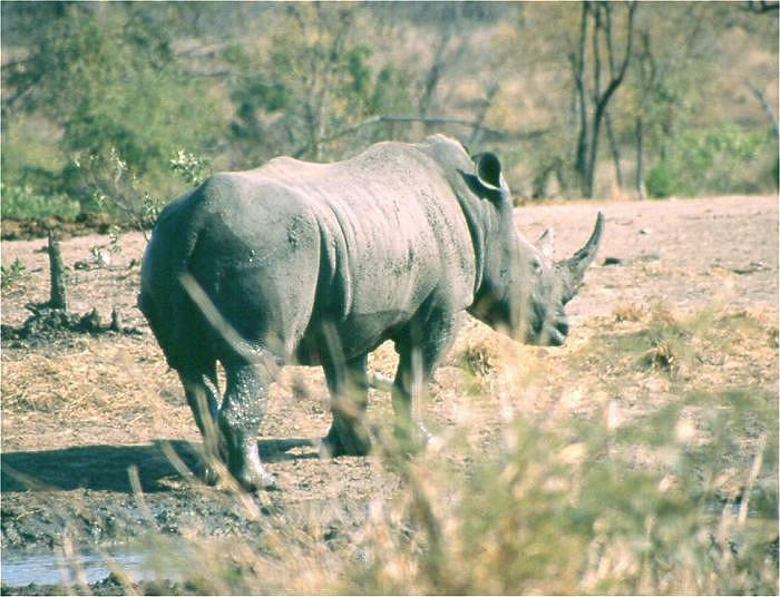 Dann geht's ins Abenteuer Wildlife! Sind ganz entzückt, Impalas (kleine Antilopen) neben der Straße grasen zu sehen, auch die im dürren Buschwerk fast unsichtbaren Zebras, die Giraffe direkt vor unserem Auto und die Affenhorde am Wasserloch sind eine neue Erfahrung für uns. Besonders mächtig Eindruck auf mich macht das Nashorn, das sich in einem Wasserloch suhlt.