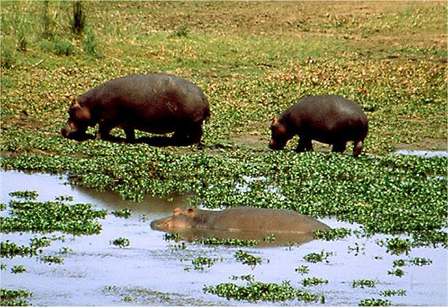 Wechseln dann auf die andere Seite des Flusses und folgen der Schotterpiste bis zum "Bird hide", einem überdachten Unterstand über dem Fluß. Unter uns liegt der Letaba, der hier mehr Wasser führt, bevölkert von zahlreichen Nilpferden, Krokodilen und Vögeln. Trotz der Mittagssonne verläßt eine Nilpferdmutter mit ihrem Jungen das Wasser und zieht grasend dem Ufer entlang.