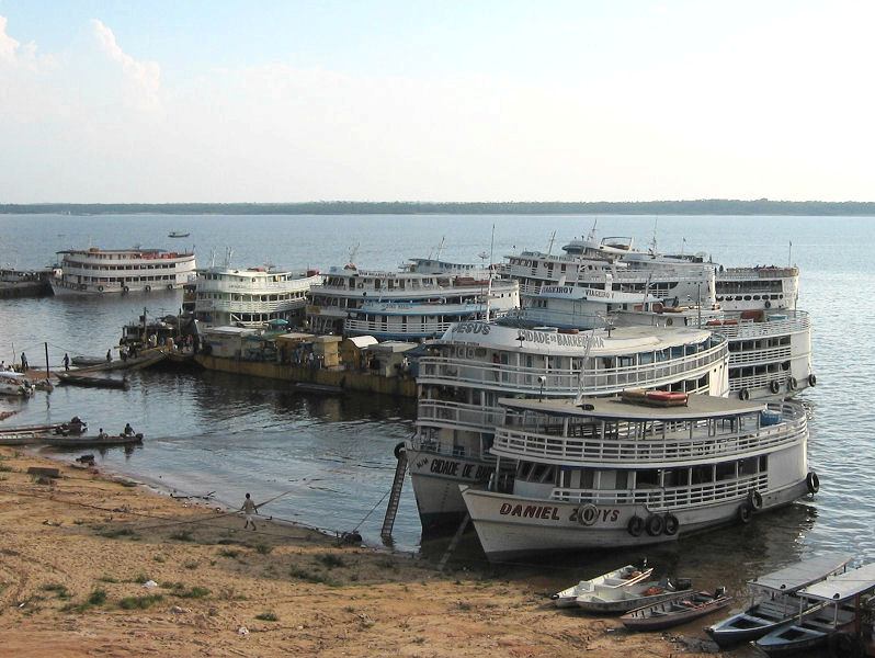 Halten eine kurze Antidurst-Pause in einem kleinen Lokal am Hafen und nehmen anschließend wieder den Bus zurück ins Zentrum. Fahren gut 50 Minuten durch Industriegebiet und Vororte, bis wir in der Nähe des Haupthafens von Manaus aussteigen. Schauen bald darauf dem Treiben auf den Passagier- und Frachtschiffen zu und schlendern durch den Markt.
