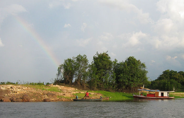 gebracht werden. Dabei handelt es sich um den Zusammenfluß von Rio Negro (einem 28° warmen Schwarzwasserfluß) und Rio Solimões (einem 21° kühlen Weißwasserfluß). Da die Wassertemperaturen und Fließgeschwindigkeiten der beiden Flüsse sehr unterschiedlich sind, brauchen die auch sehr verschieden gefärbten Wassermassen mehrere Kilometer, bis sie sich zum einheitlich aussehenden Amazonas vermischen. Bis es soweit ist, fließen die beiden Flüsse mit scharfer Trennlinie nebeneinander her. Auch ein paar Flußdelphine erweisen uns die Ehre ihrer Anwesenheit und machen den 30-Minuten-Ausflug noch zusätzlich sehenswert.