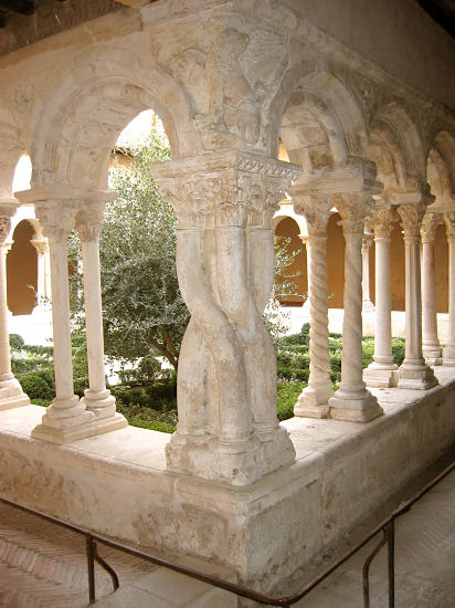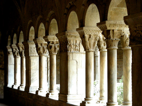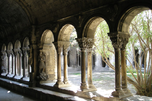 Nach einer Pause in einer Bar gegenüber spazieren wir brav zum nächsten Römerüberbleibsel, den Thermen. Eine Besichtigung von außen hätte auch gereicht, aber wir haben beim Theater ein Sammelticket erstanden, so daß wir eben auch hineingehen. Damit wir nicht nur Römer sehen, spazieren wir dann zur Kirche Saint Trophim mit einem prächtigen Portal, schlichtem Inneren und einem renovierungsbedürftigen, aber wunderschönen Kreuzgang. Aber die Jahrhunderte haben die schönen romanischen und gotischen Elemente ganz schwarz werden lassen und eine baldige Restaurierung täte Not.