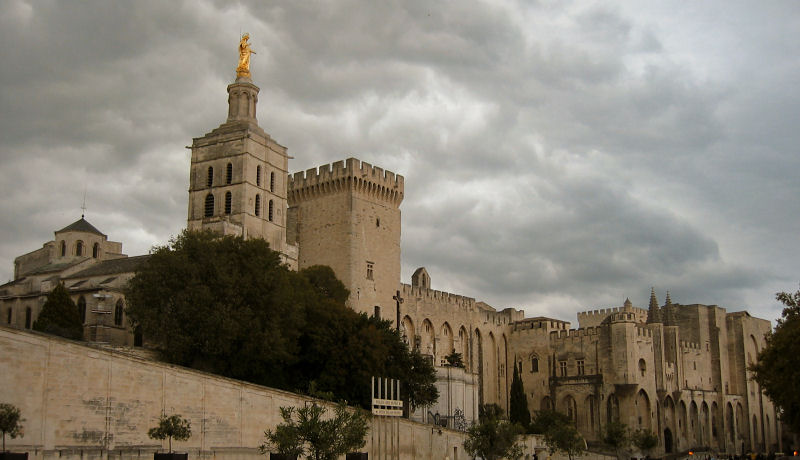 Fahren dann weiter nach Avignon und erreichen gegen 17:00 Uhr das Zentrum. Die Parkplatzsuche ist mühsam (wieder einmal Berufsverkehr) und schließlich stellen wir das Auto irgendwo an der Stadtmauer ab. Spazieren hinein in die Altstadt und müssen dabei einen ziemlich weiten Weg zur Touristeninfo zurücklegen. Versorgen uns dort mit Informationen und Stadtplan, dann spazieren wir zum Palais du Papes und zu einem Aussichtspunkt mit Blick auf die Pont d'Avignon. Der Himmel ist plötzlich grau und öffnet seine Schleusen! Retten uns zuerst in eine Kirche und danach in eine nun überfüllte Bar und warten bei einem Aperitif-Bier auf besseres Wetter. Um 19:00 Uhr hat sich alles wieder beruhigt und wir spazieren zu einem Restaurant, das wir schon von unserem Besuch vor 6 Jahren kennen und nach etwas Suchen wieder gefunden haben. Vertilgen im Au Périgord Gourmand