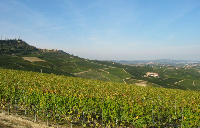Von dort hat man einen netten Blick über die mittelalterliche Stadt, sonst gibt es nicht viel. Immerhin haben wir ein bißchen Zeit vertrödelt. Da das Wetter schön ist und der Nachmittag noch lange, fahren wir querfeldein nach Barolo. Dort gibt es zwar auch nicht viel zu sehen, aber es ist etwas belebter und in einem sonnigen Gastgarten trinken wir vor der Rückfahrt ins Hotel noch einen Kaffee. Die Landschaft mit den zum Teil bereits abgeernteten Weinbergen ist sehr hübsch und das schöne Wetter trägt zur guten Stimmung bei.