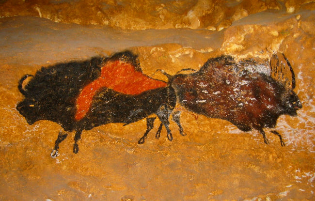 Unser Ticket schließt die Ausstellung "Lascaux revellee" mit ein, das sich als Werkstatt zur detailgetreuen Rekonstruktion der Höhlen entpuppt und günstigerweise fast genau an unserem Rückweg liegt. Bekommen dort neben Kopien der Höhlengemälde auch Videos zur Entstehung der Originale und eines Nachbaues zu sehen. Da wir die entsprechenden Hinweisschilder zu spät sehen, machen wir auch ganz ungeniert verbotene Fotos diverser Büffeldarstellungen.