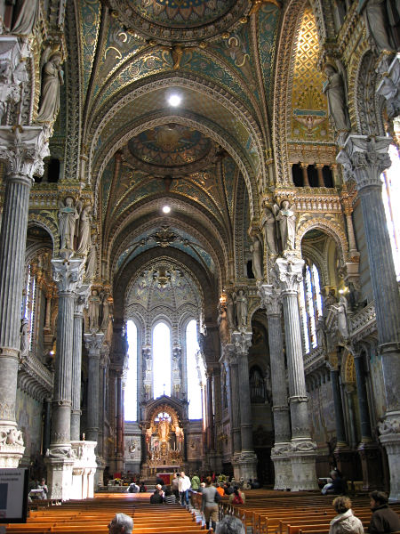 Wollen gleich auf Entdeckungstour gehen und fragen die Rezeptionistin um einen Stadtplan und ein paar Tips. Bekommen in bestem Englisch Besichtigungsvorschläge und Lokalempfehlungen - im Tourismusbüro hätte es nicht besser sein können. So aufs beste vorbereitet spazieren wir bei lebhaftem Wind, aber mehr Sonne als zuletzt, zur Metrostation und fahren ins historische Zentrum. Bei der Station Vieux Lyon steigen wir auf die Standseilbahn um und lassen uns auf den Fourvière-Hügel fahren. Gleich gegenüber der Bergstation strahlt die neobyzantinische Kirche Notre Dame de Fourvière im Sonnenlicht. Innen ist sie um einiges dunkler, aber Stuck und Mosaike, Gold und Weiß prägen die Ausstattung. Vor der Kirche kann man die große goldene Marienstatue von Nahem bewundern, die nach den abgeschlossenen Renovierungsarbeiten wieder die Kuppel des Turmes schmücken wird.