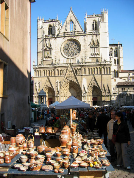Dort lassen wir uns vom lebhaften Keramikmarkt, der heute und morgen rund um die Kathedrale stattfindet, verzaubern. Etwas ruhiger ist es im Inneren der hübschen Kirche, deren bunte Glasfenster für stimmungsvolle Lichteffekte sorgen. Danach schlendern wir durch die sehr touristischen Gassen, in denen viele Läden auch jetzt am Sonntag Nachmittag geöffnet haben. Nutzen dabei auch einen der "Traboules" genannten versteckten und verdeckten Wege durch enge Hinterhöfe und schmale Durchgänge, in denen zur Hochblüte der Seidenproduktion die Stoffballen sicher vor Schmutz und Wetter transportiert werden konnten. Überqueren dann den Fluß und spazieren zum Place de Terreaux, wo das Rathaus gerade richtig in der Sonne strahlt.
