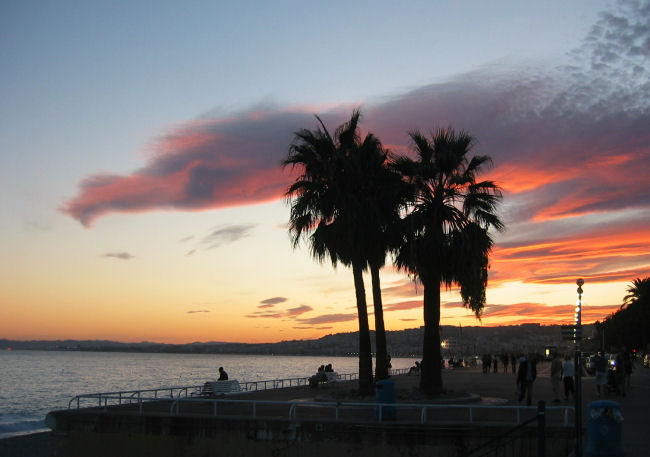 Bevor wir uns aber ein Abendessen suchen, gehen wir noch mal zurück zum Strand. Dort kommen wir gerade recht, um einen klassisch kitschigen Sonnenuntergang mit allen Rotschattierungen am Himmel zu bewundern. Anschließend gehen wir in die parallel zur Corniche verlaufende "Freßstraße" und landen in einem Fischrestaurant , wo ich endlich eine Bouillabaisse nach Originalrezept probiere - aber ehrlich gesagt, die muß nicht unbedingt sein. Auf dem Heimweg kommen wir beim Busbahnhof vorbei und nach Durchsicht der Fahrpläne beschließen wir, morgen mit dem Bus einen Ausflug nach Monaco zu machen - zum Preis von einem Euro pro Person.
