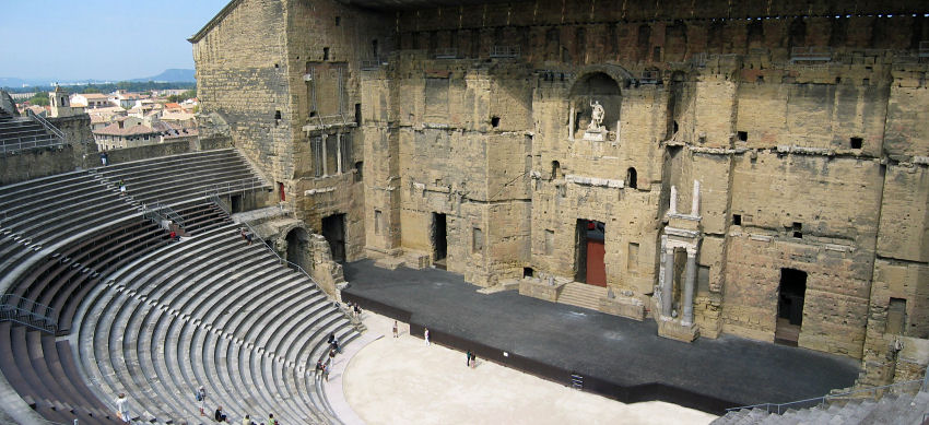 Bis wir wieder beim Auto sind, ist es nach 11:00 und wir beschließen, über die Autobahn nach Orange zu fahren. Nach 40 Minuten stellen wir unser Vehikel ab und holen in der Info einen Stadtplan mit Rundgangvorschlag. Spazieren zum römischen Theater, das mit einer fast vollständig erhaltenen Bühnenwand eine Seltenheit darstellt (so etwas gibt es nur mehr in der Türkei und in Bosra/Syrien).