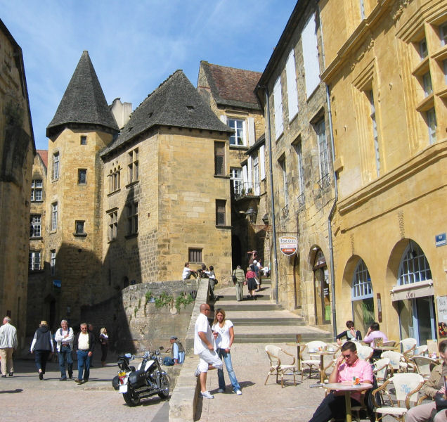Nach so vielen Höhlen und Felsbauten verzichten wir auf weitere Grotten und fahren über enge Sträßchen, durch Weinberge und Felder nach Sarlat. Ergattern einen Parkplatz am Rande der Altstadt und beginnen gegen 14:00 Uhr die Besichtigung dieser vorbildlich erhaltenen mittelalterlichen Stadt. Viele Fachwerkhäuser erstrahlen im Sonnenschein und diesen nutzen wir auch für eine Rast in einem Cafe an der Place de la Liberté. Holen dann in der Touristeninfo einen Stadtplan mit eingezeichnetem Rundgang, dem wir teilweise folgen und auf dem wir allerhand nette Gebäude finden.