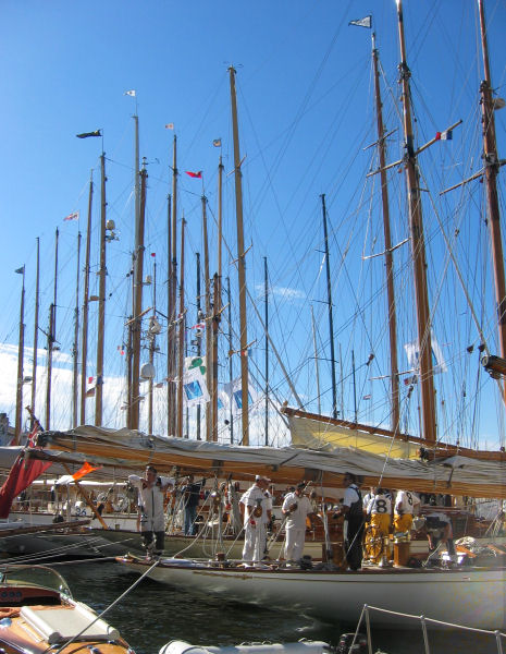 Die hypermodernen Kunststoffflitzer mit computergesteuerten Instrumenten haben ihren großen Tag erst morgen, heute sind die klassischen Holzjachten dran. Nachdem wir ihnen beim Auslaufen zugesehen haben, spazieren wir durch den eigentlich kleinen Ort und hinauf auf den Burghügel, um die stattlichen Jachten unter vollen Segeln bei der Regatta zu bewundern. Zwar ist alles etwas weit weg, aber die weite Bucht mit dem tiefblauen Meer ist den Aufstieg ohnehin wert.
