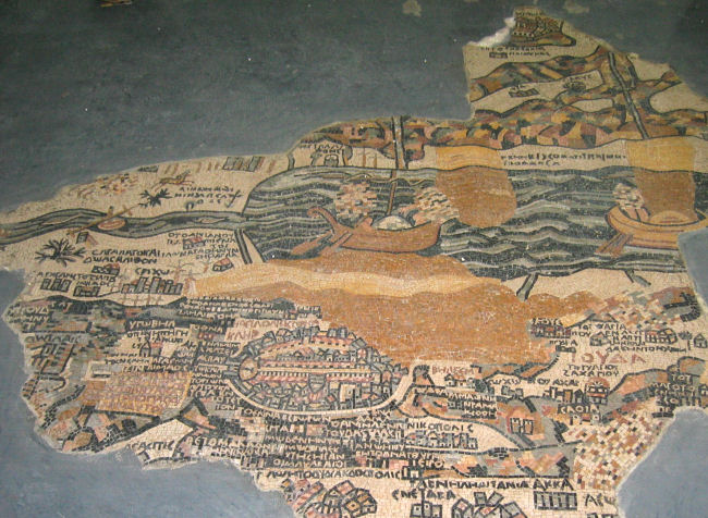 . Diese an sich kleine Stadt ist bekannt für die vielen byzantinischen Kirchen mit reichen Mosaiken. Eines der berühmtesten ist das Bodenmosaik in der St. Georgs-Kirche, das eine Landkarte Palästinas aus dem 2. Jhdt. zeigt. In unserem Programm ist leider nur für die Besichtigung dieses Mosaiks Zeit, denn schon bald müssen wir weiter, um uns in einer modernen Mosaikwerkstatt die Herstellung einst und jetzt erklären zu lassen. Der Möglichkeit eines Souvenireinkaufes widerstehen wir angesichts des Gewichtes und der stattlichen Preise für fein gearbeitete Stücke.