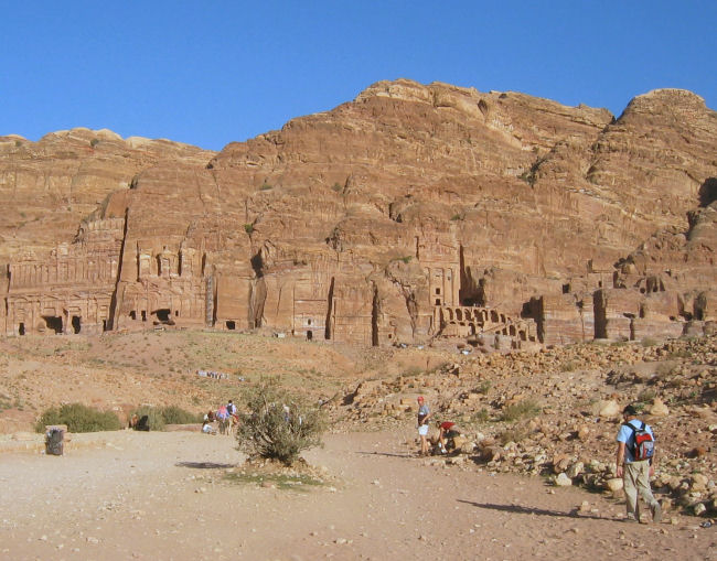 , eine Felswand mit prunkvoll gearbeiteten Grabtempeln. Wir gehen aber weiter über die einstige römische Straße durch das Zentrum der nabatäischen Hauptstadt. Hier finden sich nur wenige interessante Reste der Siedlung, am ehesten noch das Amphitheater, dafür aber massenweise Souvenirstände. Am Ende des Tales bietet neben dem römischen Tempel ein Restaurant dem Besucher Schatten und Labung, allerdings nur ein Buffet-Menü, keine Snacks oder Getränke zum Mitnehmen.