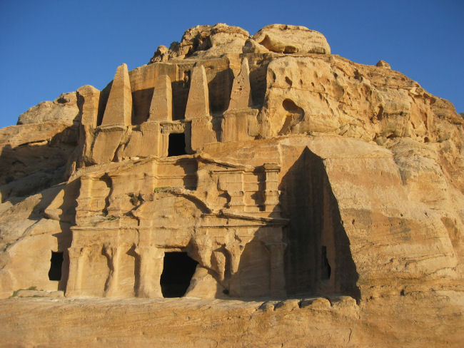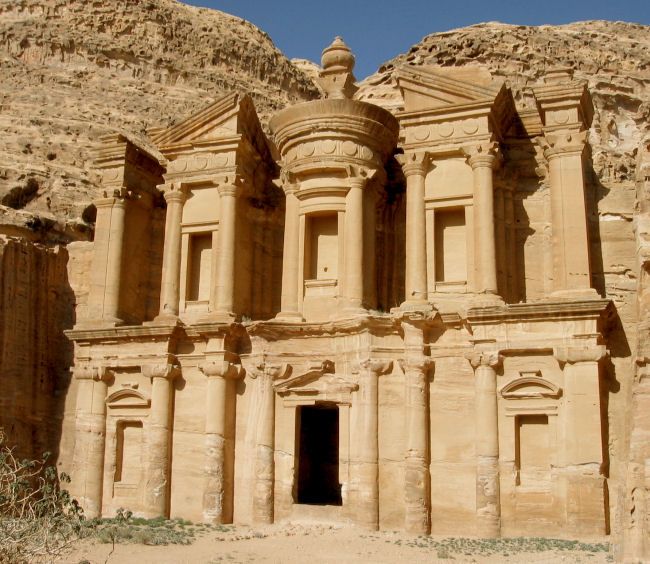 ist erreicht. Alles ist aus dem roten Sandstein herausgemeißelt, exakt und wohlproportioniert - eine Wucht. Obwohl es nichts mit Ägyptern zu tun hat, hält sich der irreführende Name "Schatzhaus des Pharao" für eines der bedeutendsten Gräber der Felsenstadt hartnäckig. Das Innere ist abgesehen von der Vorhalle unter den Säulen schmucklos und nicht sehr aufregend, trotzdem wird es von Uniformierten bewacht. Fotografieren sollte man am Vormittag - nachmitags ist das Licht diffus und nicht mehr so plastisch.