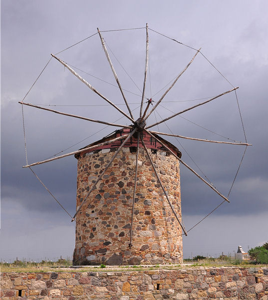 Für so viel sportliche Betätigung belohnen wir uns noch in den Bergen im Fischrestaurant "Old Pili" mit Dolmades (gefüllte Weinblätter) und Scampi und rasten bis 14:00 Uhr. Kurven dann wieder hinunter zur Hauptstraße, der wir bis Antimachia im Zentrum der Insel folgen. Die einzige touristische Attraktion ist die letzte intakte Windmühle, die wir jedoch erst im zweiten Anlauf finden, denn die Tuchbespannung der Flügel ist nicht mehr vorhanden, sodaß wir zuerst achtlos am runden Sockel vorbeigefahren sind. Nach den Pflichtfotos fahren wir weiter westwärts und folgen immer wieder verschiedenen Stichsträßchen zu einer Bucht oder einem Sandstrand.