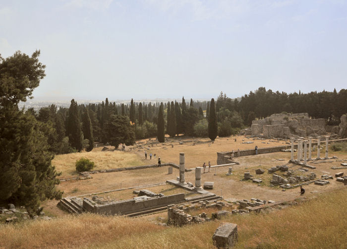 Der nächste planmäßige Stopp ist in Kámiros, dort sind die Ruinen des kleinsten der drei antiken Stadtstaaten der Insel zu besichtigen. Stapfen gegen 15:30 los und bestaunen Mauerreste und Tempelfragmente. Steigen hügelan und können von dort oben wieder über das weite Meer blicken.