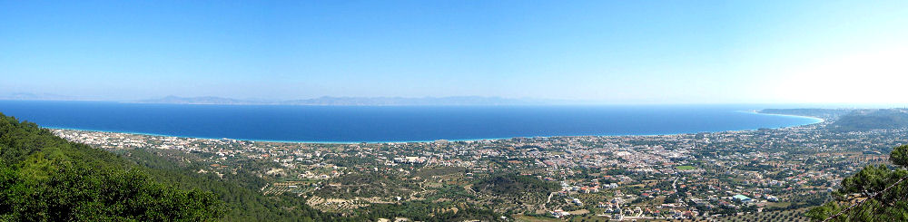 Fahren querfeldein und finden problemlos die Zufahrt zum Berg Filérimos. Dort oben stehen die sehr spärlichen Reste der antiken Stadt Ilyssos - zu sehen gibt es noch eine rekonstruierte Kreuzritterburg und eine orthodoxe Klosteranlage. Im ganzen Gelände sind unzählige Pfauen unterwegs und im hohen Gras ist sogar eine Henne mit einer Schar Kücken zu sehen. Interessanter als das Gemäuer ist der Blick vom Aussichtspunkt weit über die Bucht bis zur Nordspitze der Insel und Rhodos Stadt. Gegenüber der eingezäunten Anlage führt ein schattiger Weg zu einem anderen Aussichtspunkt mit einem von innen begehbaren großen Kreuz und Blick ins Hinterland.