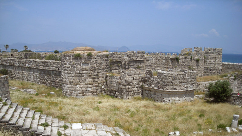 Jetzt fehlt uns eigentlich nur mehr das alte Kastell am Hafen und die Platane des Hippokrates davor. Schlendern gemütlich durch die Gassen und schauen uns dann die Festung der Kreuzritter an. Nach der Umrundung der Festungsmauern mit Blick aufs Meer und diverse steinerne Zeitzeugen gehen wir auf kürzestem Weg zurück zum Auto, das noch immer auf einem kostenlosen Parkplatz bei der Casa Romana steht.