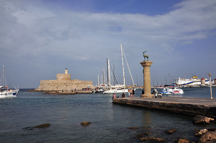 Nach soviel Vergangenheit spazieren wir wieder in die Gegenwart und bummeln am Hafen bis vor zur Einfahrt. Dort steht derzeit nur eine der beiden Säulen mit dem rhodischen Wappentier, dem Hirsch. Im milden Abendlicht ist auch die orthodoxe Verkündigungskirche hübsch anzusehen.