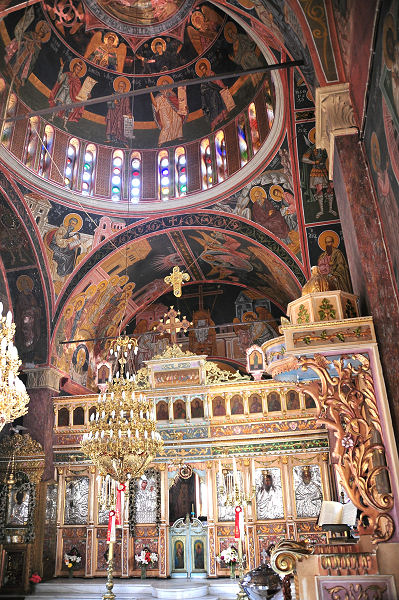 Fahren daher ohne Mittagspause weiter und zurück in den Norden. Überqueren dabei das gebirgige Inselinnere und kommen an der Westküste nach Siána. Dort strahlt uns eine hübsche Kirche an, die auch im Inneren sehenswert ist.