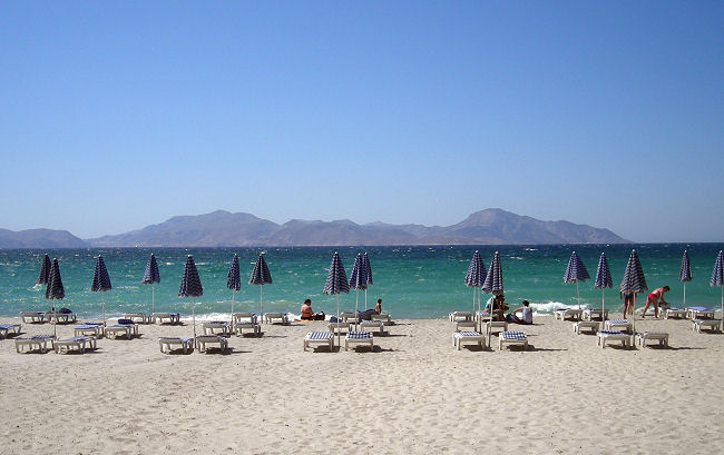 Fahren mit dem PKW nach Zürich und nehmen dort die Dienste des "Airportparking-Service" in Anspruch. Können direkt am Abflugterminal aussteigen und lassen unser Auto wegbringen. Checken die Rucksäcke ein und warten auf den Abflug, der kurz nach 10:00 Uhr erfolgt. Nach ca. dreistündigem Flug landen wir mit einer Stunde Zeitverschiebung bei leicht bedecktem Himmel auf der viertgrößten griechischen Insel. Unser Autovermieter hat sein Büro am anderen Ende des Flughafen-Parkplatzes und dort bekommen wir einen putzigkleinen Chevrolet Matiz mit Faltdach. Unser Gepäck hat gerade Platz im Kofferraum und schon bald folgen wir den nur bedingt leserlichen Schildern vom Airport nach Kos-Stadt. Finden erstaunlich problemlos zum ca. 7 km westlich gelegenen Hotel "Oceanis Beach Resort" in Psalidi und bekommen ein Zimmer im dritten Stock mit seitlichem Meerblick vom Balkon aus.