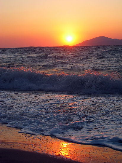 Bei etwas mehr Wellengang als bei der Hinfahrt kommen wir pünktlich um 17:30 im Hafen von Kos an. Lassen uns von einem Taxi nach Mastichari zu unserem letzten Quartier bringen. Nach 20 Minuten Fahrt sind wir in unserem Hotel "Princess of Kos". Das ist eine reine All-Inclusive-Enklave, was uns immerhin das Armband erspart. Wir bekommen ein Erdgeschoß-Zimmer in einem der vielen Häuschen am langen Weg zum Strand. Nach einer schnellen Erkundungstour und einem Begrüßungsschluck in der Mainbar beginnt die Schlacht am lauwarmen Buffet. Zum Dessert gönnen wir uns einen Schluck Ouzo und einen Spaziergang zum Strand mit kitschig schönem Sonnenuntergang.