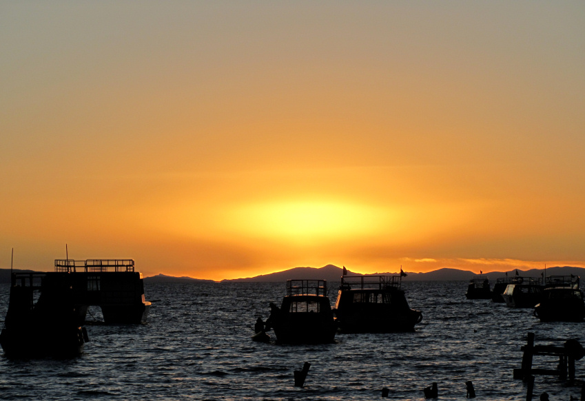 Von dort fahren wir über eine kurvige Bergstraße noch eine knappe Stunde, bis wir im Abendlicht den Wallfahrtsort Copacabana vor uns liegen sehen.