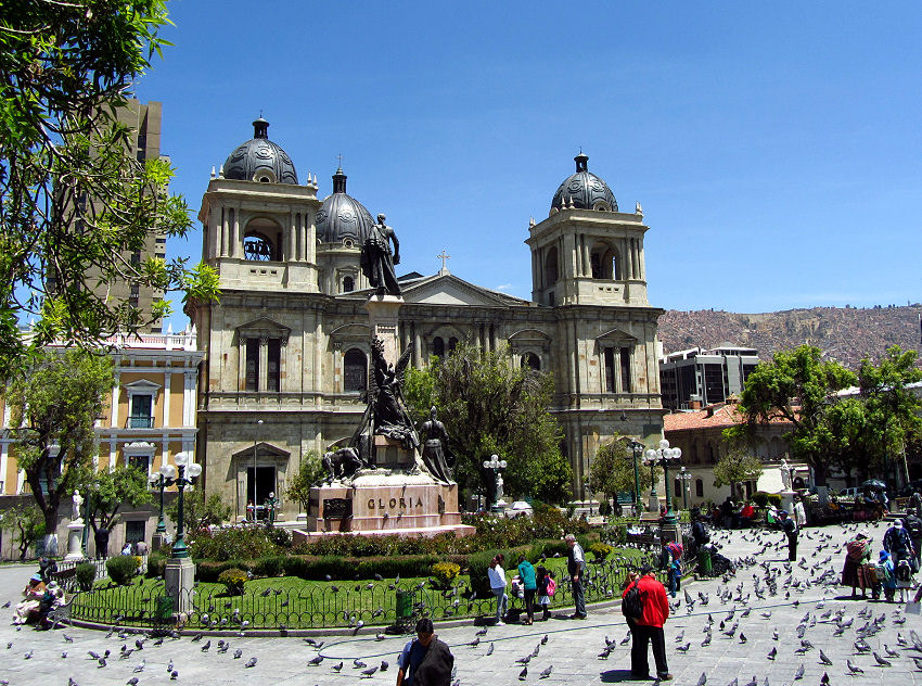 Kinder ausgeführt und Erinnerungsfotos geschossen. Wir Touristen interessieren uns aber mehr für das Murillo-Denkmal in der Mitte, sowie das Parlament auf der einen Seite, die Kathedrale und der Regierungspalast mit pittoresker Palastwache auf der anderen Seite des Platzes.