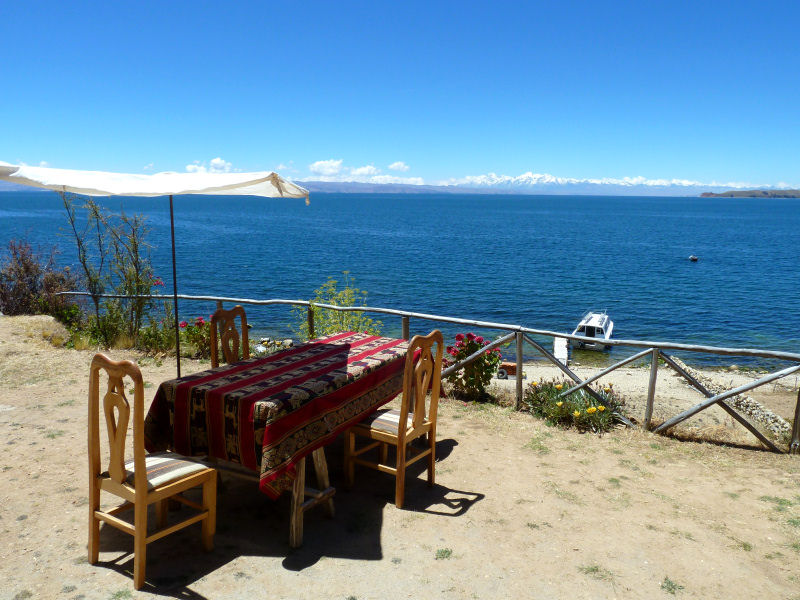 Um halb zwölf tuckern wir dann hinüber zur Isla del Sol. Dort legen wir bei einem namenlosen Steg an und steigen hinauf zu einem einsamen Häuschen. Es entpuppt sich als winziges Restaurant in dem einzig für uns ein Tisch gedeckt ist. Wir bekommen ein so genanntes "Buffet andino", das heißt verschiedene traditionelle Gerichte kommen alle gleichzeitig auf den Tisch. In unserem Fall diverse frische und getrocknete Kartoffelsorten und Bohnen in einem Tuch, dazu je ein Teller mit Hühnchen, Fisch und luftigen Tortillas. Wirklich gut! Als Dessert gibt es noch Obst und die tolle Aussicht gratis dazu.