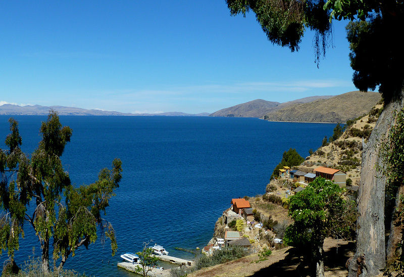 Der kürzeste Weg zu unserem heutigen Übernachtungsort Copacabana führt die Straße weiter und über peruanisches Gebiet, aber so einfach geht das nicht. Wir müssen wieder eine Stunde zurück bis El Alto, dort zweigen wir ab und dann geht es auf einer anderen Hauptstraße westwärts. Folgen eine kleine Weile den Ufern des Titicaca-Sees, der uns mit den verschiedensten Blau- und Türkis-Tönen begeistert, dann erreichen wir an der schmalsten Stelle des Sees den Fährhafen San Pedro. Dort wechseln wir auf eine kleine Personenfähre, während unser Minibus auf eine wackelige Holzautofähre rollt. Wir legen später ab, sind aber früher am circa 800 m entfernten Ufer der Halbinsel.