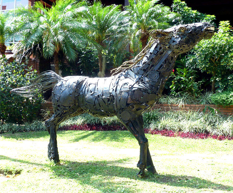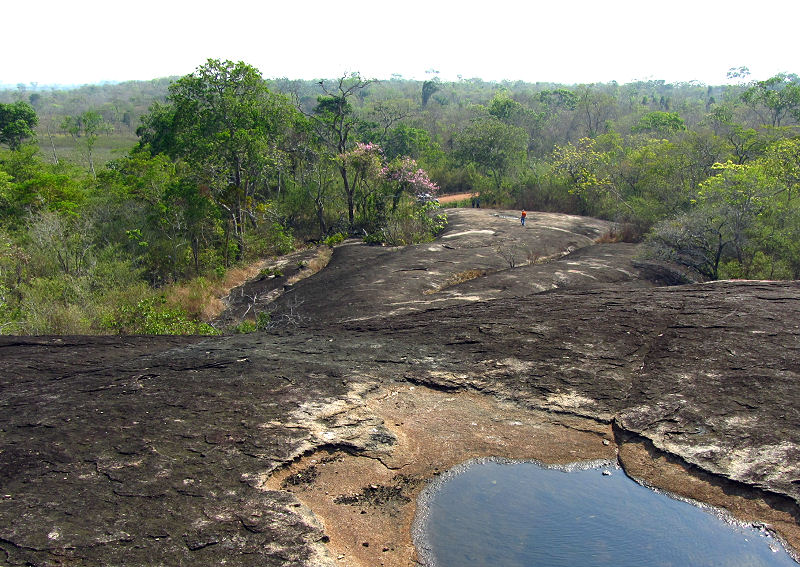 Um halb neun beginnt die Fahrt zu den diversen Naturschönheiten, die die Chiquitanía bietet. Beginnen bei einem mächtigen Granitfelsen, der seit mehreren tausend Jahren irgendwie unmotiviert mitten in der üppigen Vegetation liegt. Klettern über den schwarzen Rücken des Ungetüms, dann geht die Fahrt zum Tanken zurück nach Concepción. Anschließend besuchen wir das Naherholungsgebiet mit einem Stausee, der zum Baden und als Trinkwasserreservoir dient. Rumpeln zurück nach San Javier, wo die schöne Kirche nun von vorne angestrahlt wird. Vor dem Mittagessen (findet wieder im Lokal von gestern statt) spazieren wir etwas durch den Ort, unter anderem zu einem Ficus-Baum, der auf mächtigen Granitfelsen wurzelt und zu einem begehbaren Kunstwerk, einem Granitlabyrinth mit Metallskulpturen.