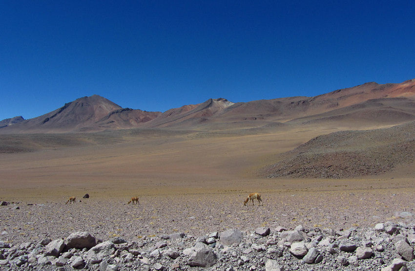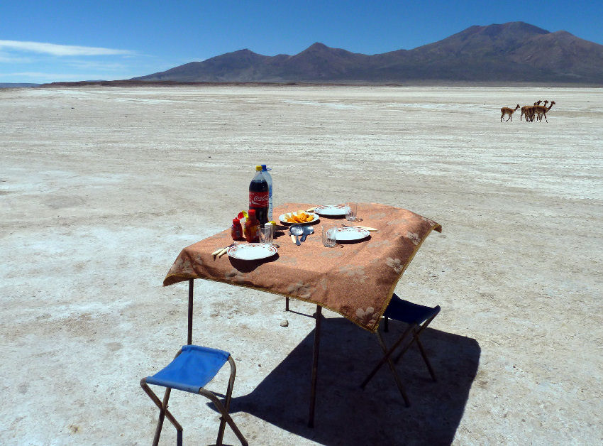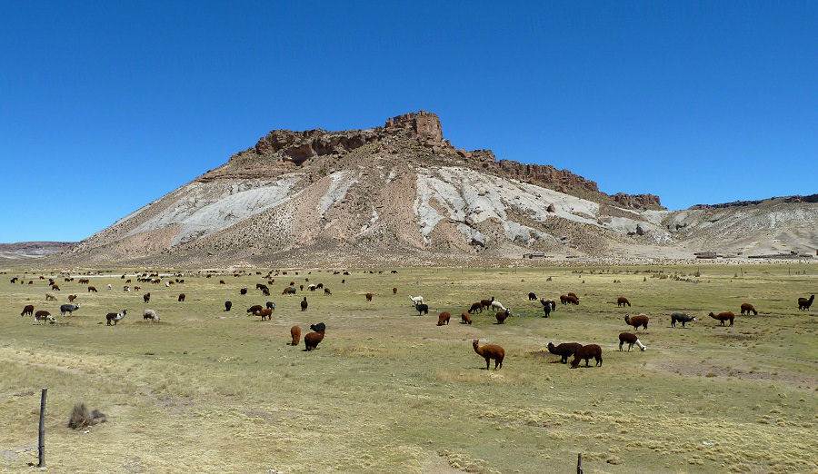 Kommen dann zum nördlichen Ufer des Salzsees, wo am Fuße des Vulkans Tunupa eine Lama-Herde friedlich grast. Genießen nochmals den Ausblick zurück auf die Weite des Salars und die unglaubliche Ruhe und Abgeschiedenheit dieses Ortes.