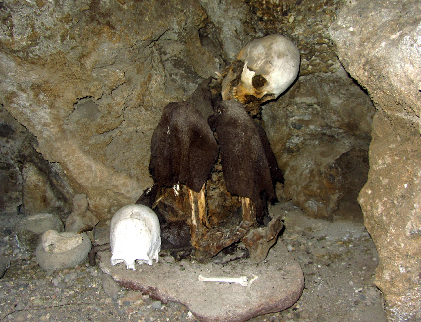 Brausen dann fast zwei Stunden quer über den Salar, nur mit einem kurzen Zwischenstopp bei einer Kaktusinsel. Am "Südufer" des Salzsees, bei der Ortschaft Aguaquiza, besuchen wir dann zwei Höhlen, von denen eine erst vor wenigen Jahren entdeckt wurde und im Inneren durch feine Steinformationen - fast wie Wespennester - beeindruckt. Die andere nur wenige Meter daneben ist schon seit Jahrhunderten bekannt. Im Inneren finden sich unzählige Chullpas (Inkagräber) und noch einige Schädel und Scherben.