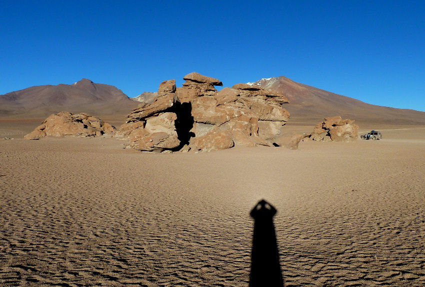 Weckruf um 5:05, Katzenwäsche bei Kerzenschein, bis wir merken, dass es entgegen der Ankündigung doch elektrisches Licht gibt ;o). Nach einem reichlichen Frühstück legen wir schon um halb sieben dick eingepackt los. Fahren durch die Siloli-Wüste zum ersten Pflichtstopp, dem Arbol de Piedra, einem verwitterten Stein in Baumform inmitten anderer verwitterter Felsbrocken. Die Sonne ist gerade aufgegangen, aber es ist seeeehr kalt und ohne Mütze und Handschuhe nicht auszuhalten - auch ohne Wind.