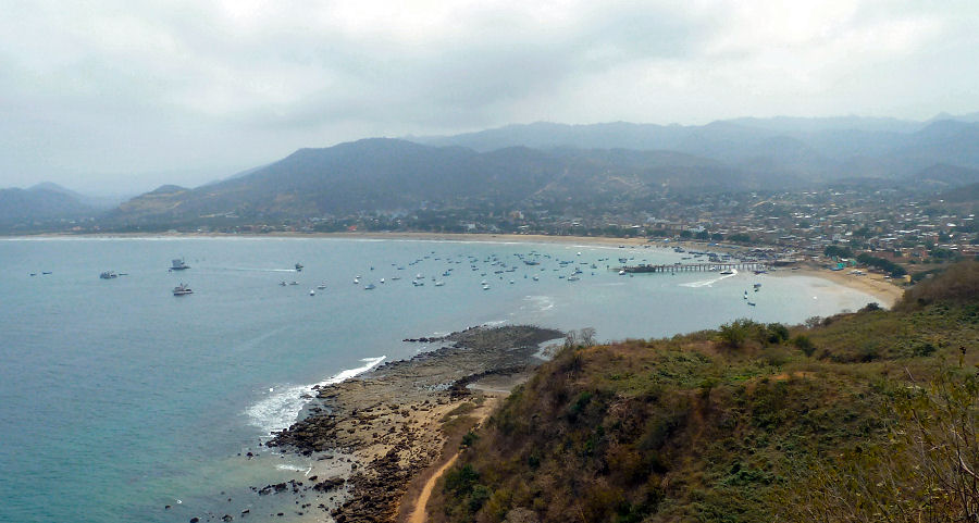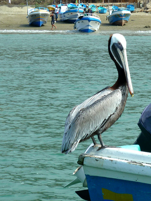 Um elf dümpeln wir zusammen mit 18 weiteren Touristen hinaus aufs Meer, um uns von den Buckelwalen beeindrucken zu lassen. So ruhig wie am Titicaca-See ist das Wasser hier nicht, aber die Aussicht auf die garantierte Walsichtung beruhigt alle. Nach circa 45 Minuten wird der Kapitän langsamer und lässt auf der Suche nach den Meeressäugern das Ruder laufen, was bei einigen Mitreisenden Tribut fordert ;o). Irgendwo gaaaanz weit weg ist ein Schatten zu erkennen, was es ist jedoch nicht. Trotz Ausschau in alle Richtungen sehen wir bis Mittag keine Wale, lediglich 2 Meeresschildkröten bringen etwas Abwechslung. Zur Mittagspause fahren wir in eine kleine Bucht, wo einige Mitfahrer die Gelegenheit zum Schnorcheln nutzen. Bald wird es Zeit für die Rückfahrt, die an einer kleinen Blaufußtölpel-Kolonie vorbeiführt und um 15:00 Uhr legen wir wieder im Hafen von Puerto López an. Also leider keine Wale, aber was soll's, wir haben einen lustigen Ausflug gemacht und nebenbei doch viel Neues über die Küstenregion gelernt.