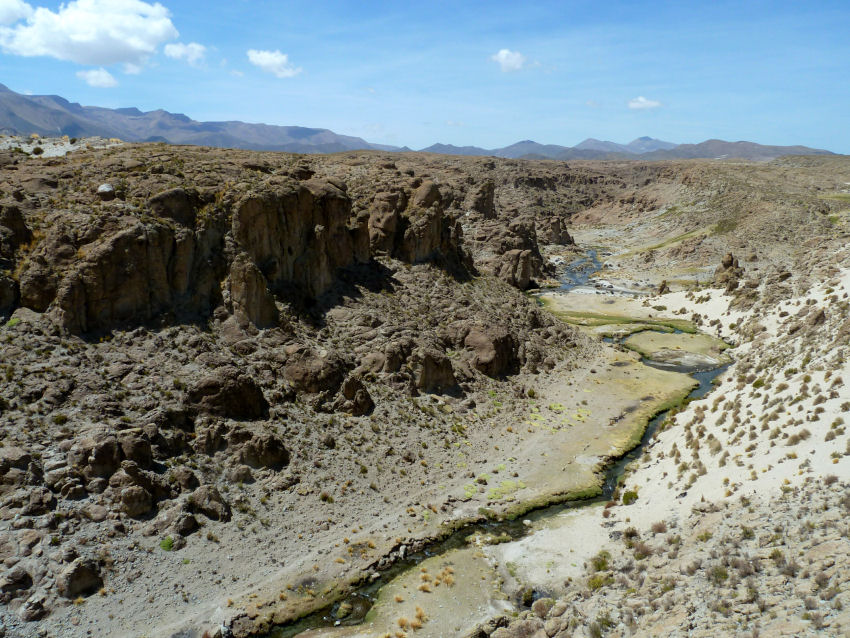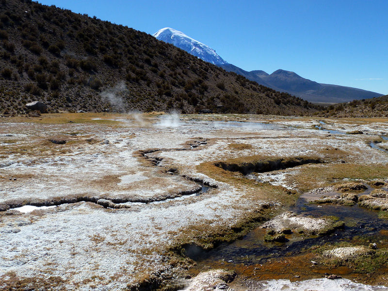 Aber erfreulicherweise gibt es wirklich kurz nach halb sieben schön heißes Wasser für eine aufmunternde Dusche. Das Frühstück hilft dann auch noch, die Lebensgeister wieder aufzutauen. Um 8:00 laden wir das Gepäck ins Auto und rumpeln weiter in den Sajama-Nationalpark hinein. Im Dorf Sajama besorgt Omar noch ein paar Kleinigkeiten, dann geht es weiter, über Stock und Stein immer weiter aufwärts. Folgen dabei einem kleinen Gewässer, das über die Bergwiesen mäandert. Das Gras ist teilweise mit Eis überzogen, aber am Ende der Piste warten Dampfschwaden auf uns.