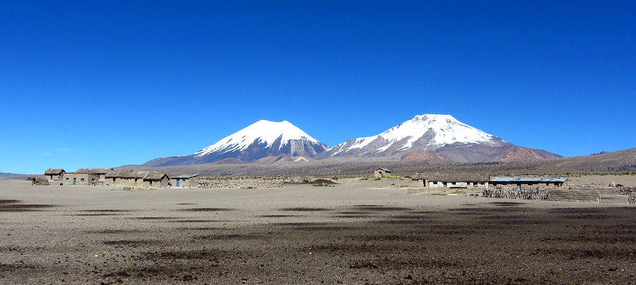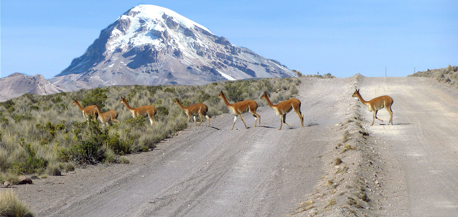Nach diesem interessanten Ausflug zu den Geysiren (sie legen erst im Winter so richtig los, dann ist es dort auch etwas gefährlicher) holpern wir zurück ins Tal und haben dabei immer einen der drei schneebedeckten Vulkane (Sajama, Parinacota und Pomerape) im Blick. Umrunden auf holprigen Pisten den Sajama, der sich von allen Seiten mächtig und majestätisch zeigt. Verlassen den Nationalpark ganz nahe an der chilenischen Grenzstation und düsen über die gut ausgebaute Nationalstraße zurück in die Zivilisation.