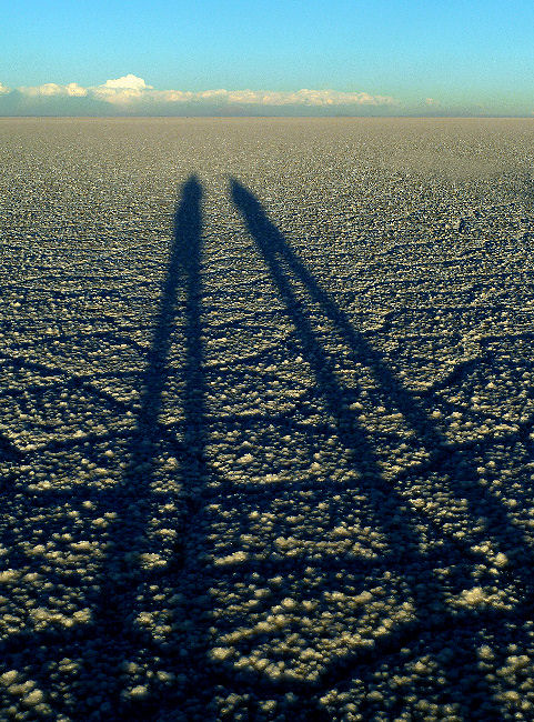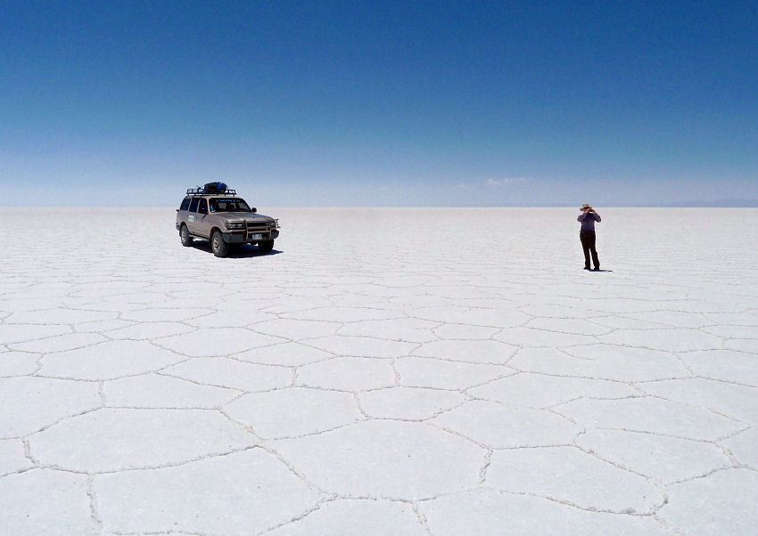 Laut Reiseplan steht jetzt "nur mehr" die Fahrt zum heutigen Hotel an, die ist aber lange und Placido kennt noch weitere Sehenswürdigkeiten. Vertrauen auf seine Ortskenntnis und breschen mit ihm ganz einsam über den Salar. Irgendwo im Nirgendwo bleiben wir stehen und sehen erstaunt, dass die Salzkruste hier nur ca. 30 cm dick ist und wassergefüllte Löcher aufweist aus denen Placido wunderschöne Salzkristalle holt. Außerdem ist die Gegend hier ideal für die skurrilsten Fotos geeignet - die riesige weiße ebene Fläche ist besser als jedes Fotostudio oder nachträgliches Bearbeiten mit Bildbearbeitungsprogrammen.