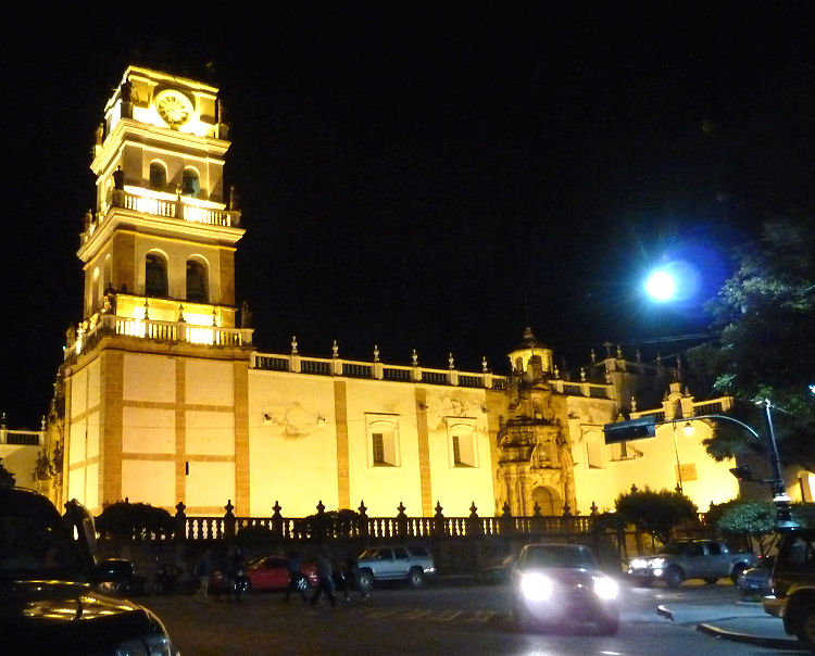Die gut ausgebaute Straße führt von noch immer atemraubenden 4000 Metern Seehöhe auf angenehme 2000 m hinunter. Unterwegs besorgt sich unser flotter Fahrer in einem kleinen Dorf ein Säckchen frische Coca-Blätter um die Fahrt hin und zurück gut zu bewältigen. So sind wir knapp drei Stunden in Dämmerung und Dunkelheit unterwegs, bis wir im Zentrum der Hauptstadt Boliviens unser Hotel erreichen. Bekommen ein nettes Zimmer in dem alten Stadtpalais und machen uns rasch auf eine erste Erkundungstour. Wohnen fast im Zentrum, wohin wir auch als erstes spazieren. In dieser Universitätsstadt sind viele junge Leute und junge Lokale. In einem davon essen wir ein gutes kleines Abendessen untermalt mit schwungvoller Musik.