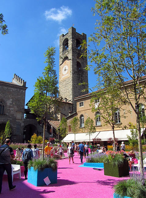 Gehen dann durch die Säulenhalle des Palazzo della Ragione zur Piazza Vecchia. Überrascht stellen wir fest, dass der alte Platz derzeit ganz mit pinkem und türkisem Plüsch bedeckt ist. Gewöhnungsbedürftig, aber ganz witzig!