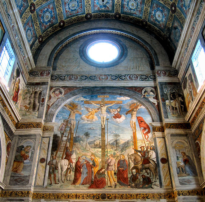 Nachdem wir nach Ablauf der Besichtigungszeit unbarmherzig hinauskomplimentiert wurden, spazieren wir noch durch den Kreuzgang des Klosters. Dort befindet sich die "Sakristei des Bramante" mit wunderbaren Wand- und Deckengemälden und zu unserem Besuchszeitpunkt eine Ausstellung mit Blättern aus dem Codex atlanticus von Leonardo da Vinci. Erstehen auch dafür ein Kombiticket, denn weitere Blätter sind in der Biblioteca Ambrosiana ausgestellt, die wir morgen besuchen wollen.