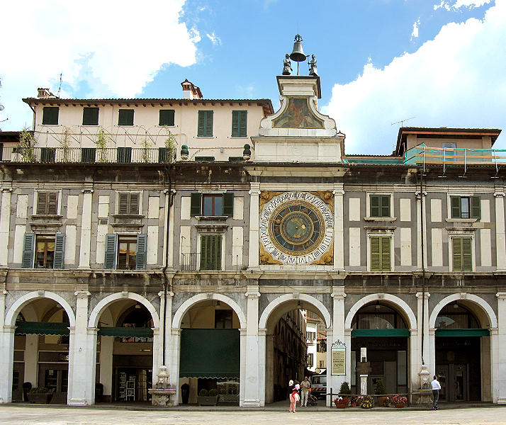 Beschließen notgedrungen, die Sachen, die von außen zu besichtigen sind, anzusehen. Spazieren zum Palazzo della Loggia aus dem 15. Jahrhundert, heute Sitz der Stadtverwaltung. Am Platz davor legen wir in einem Straßencafé eine Pause ein und warten, bis die Sonne für ein Foto des Palazzo durch die Wolken bricht. Dann spazieren wir hinauf zum Kastell mit dem Standesamt. Von den Kasematten hat man einen ganz passablen Blick über die Stadt und wir müssen ja die Zeit bis zum Öffnen der beiden Kirchen am Domplatz vertrödeln.