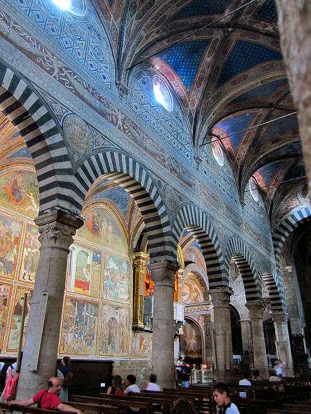 Dann fahren wir mit einem Aufzug in die Altstadt, die von noch viel mehr Touristen bevölkert wird als Volterra. Nehmen uns ein paar Stunden Zeit, um das herausgeputzte Städtchen zu besichtigen. Irgendwie passen die vollkommen eben gepflasterten Straßen aber nicht so recht zum mittelalterlichen Rest. Besuchen das Dommuseum und anschließend den mit wunderschönen Wandmalereien geschmückten Dom, wo wir vor lauter Begeisterung das Fotografierverbot glatt übersehen :-). Ein paar der Türme könnten bestiegen werden, aber angesichts des trüben Himmels verkneifen wir uns diese schweißtreibende Aktivität.